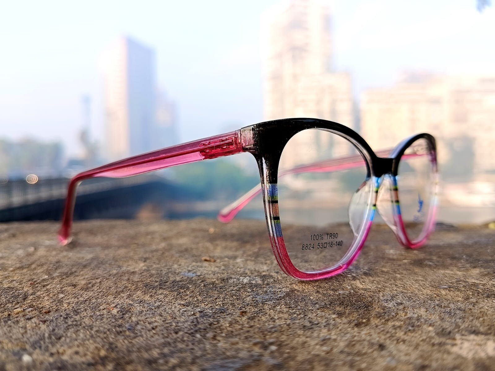 نظارات طبية بإطار CAT EYE من مادة الاسيتات تتميز باللون الوردي والأسود. الإطار خفيف الوزن للغاية ومرن ومتين، مما يجعله مريحاً للارتداء لفترات طويلة.
